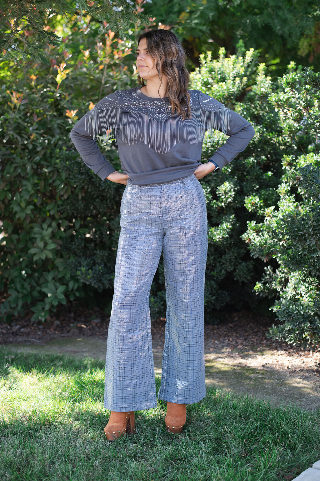 Make a bold entrance in the Cowgirl Couture Pant — a wide-leg, plaid showstopper dusted with shimmering sequins for that signature Rodeo Quincy sparkle. Equal parts vintage cowgirl and modern muse, these pants turn every step into a statement of confidence and Western glamour.