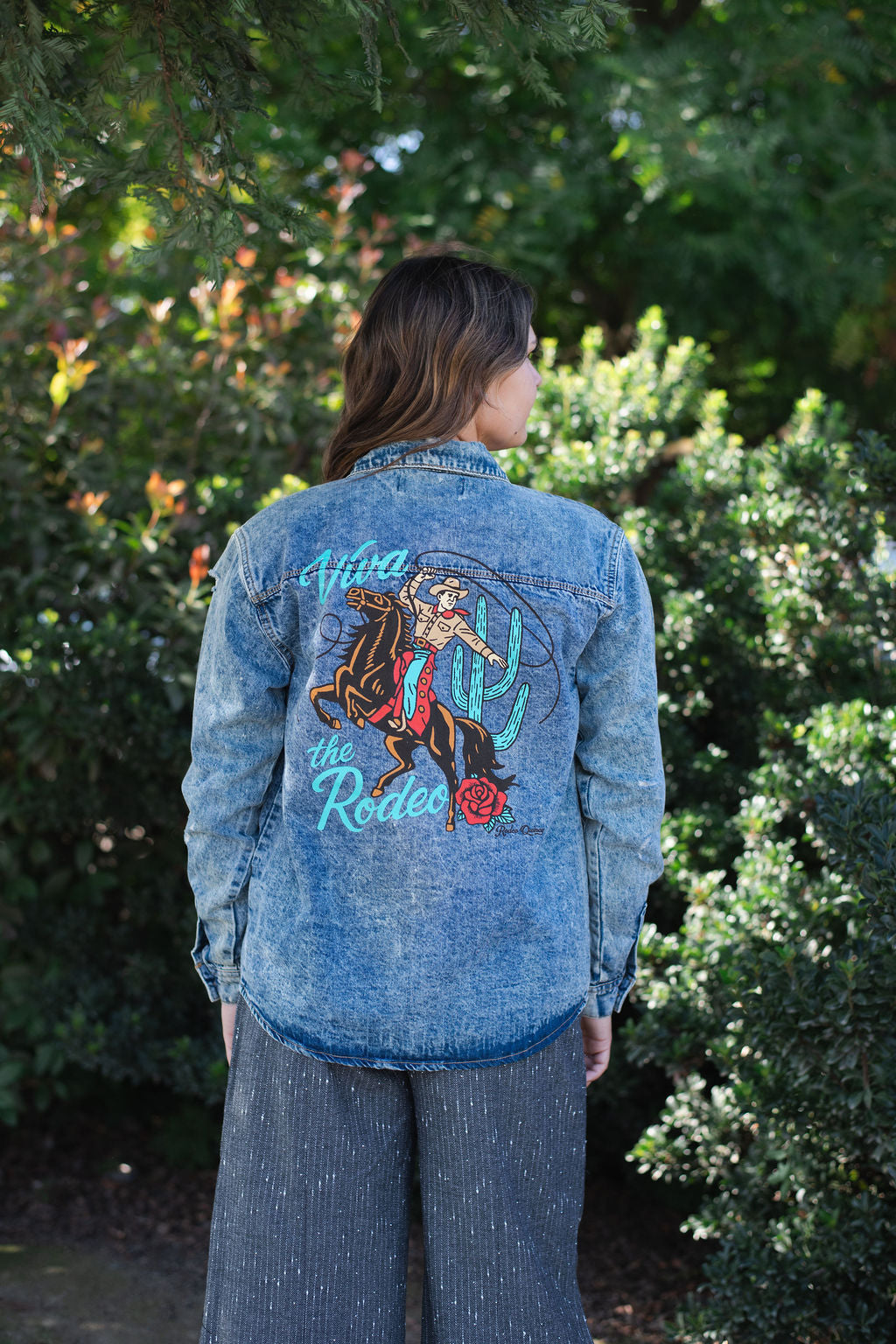 Yeehaw! Saddle up and show off your rodeo spirit with the Viva the Rodeo Jacket. This denim jacket features the phrase "Viva the Rodeo" to add a touch of playfulness to your outfit. Perfect for those who love to embrace their inner cowgirl or cowboy. Ride on!