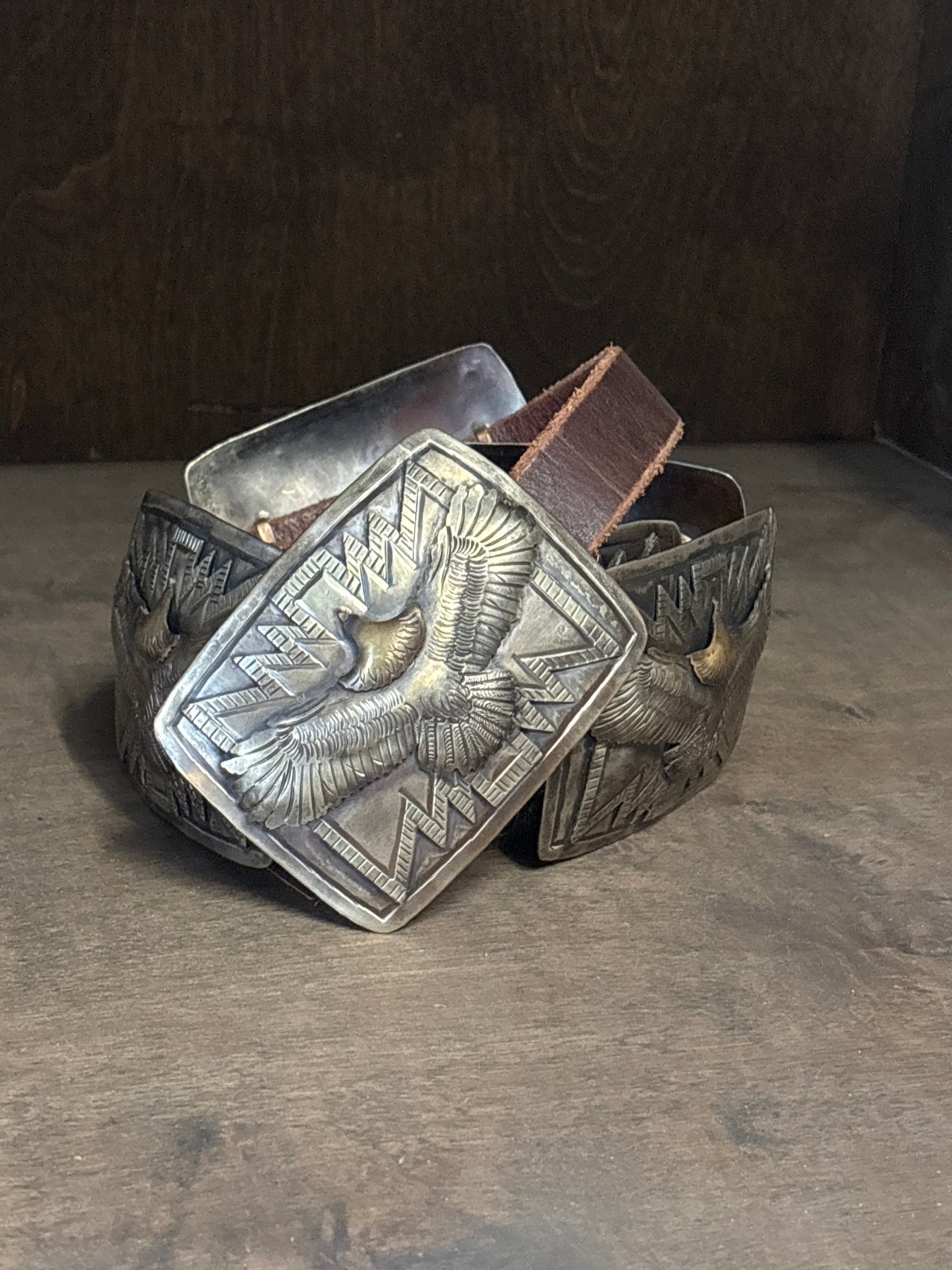Celebrate timeless craftsmanship with this German Silver Concho Belt featuring a striking flying eagle and mountain design. Its detailed motifs evoke strength and freedom, making it a powerful accessory to elevate any outfit. Durable and stylish, this belt blends tradition with bold expression, perfect for those who appreciate meaningful, enduring fashion.