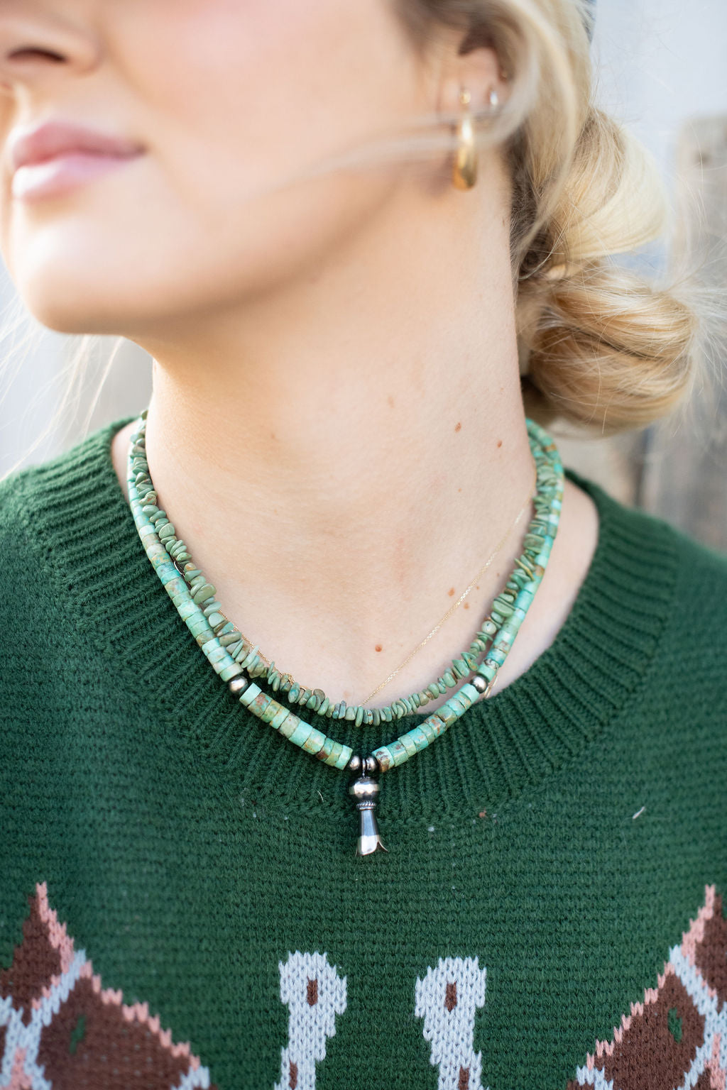 Adorable mountain turquoise necklace that brings a pop of natural charm to any outfit. This sweet stone pendant captures the earthy elegance of the Southwest, perfect for layering or wearing solo. Whether you're channeling boho vibes or adding a touch of rustic warmth to your everyday look, this little beauty is sure to become your go-to accessory. Handpicked turquoise tones make each piece wonderfully unique.