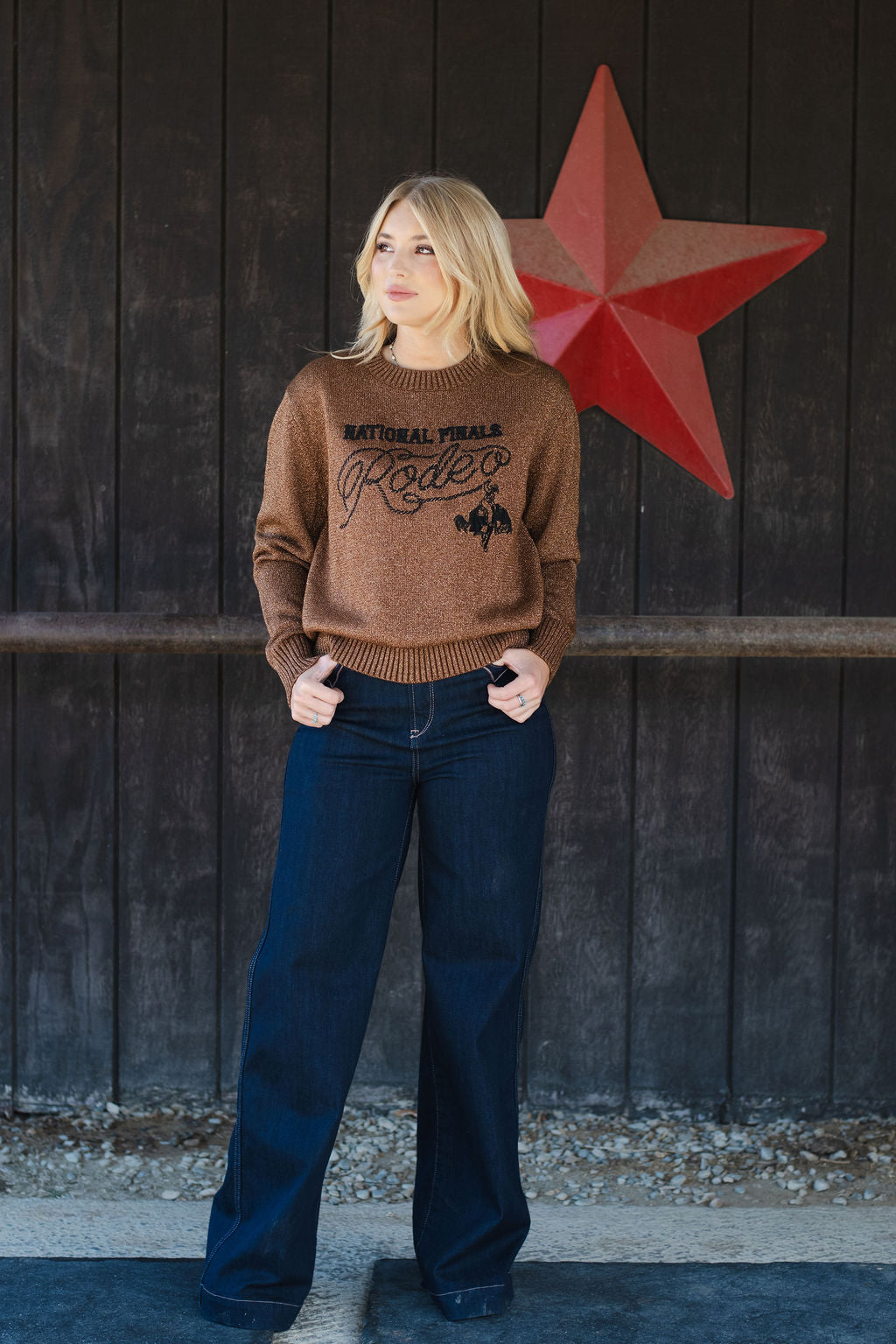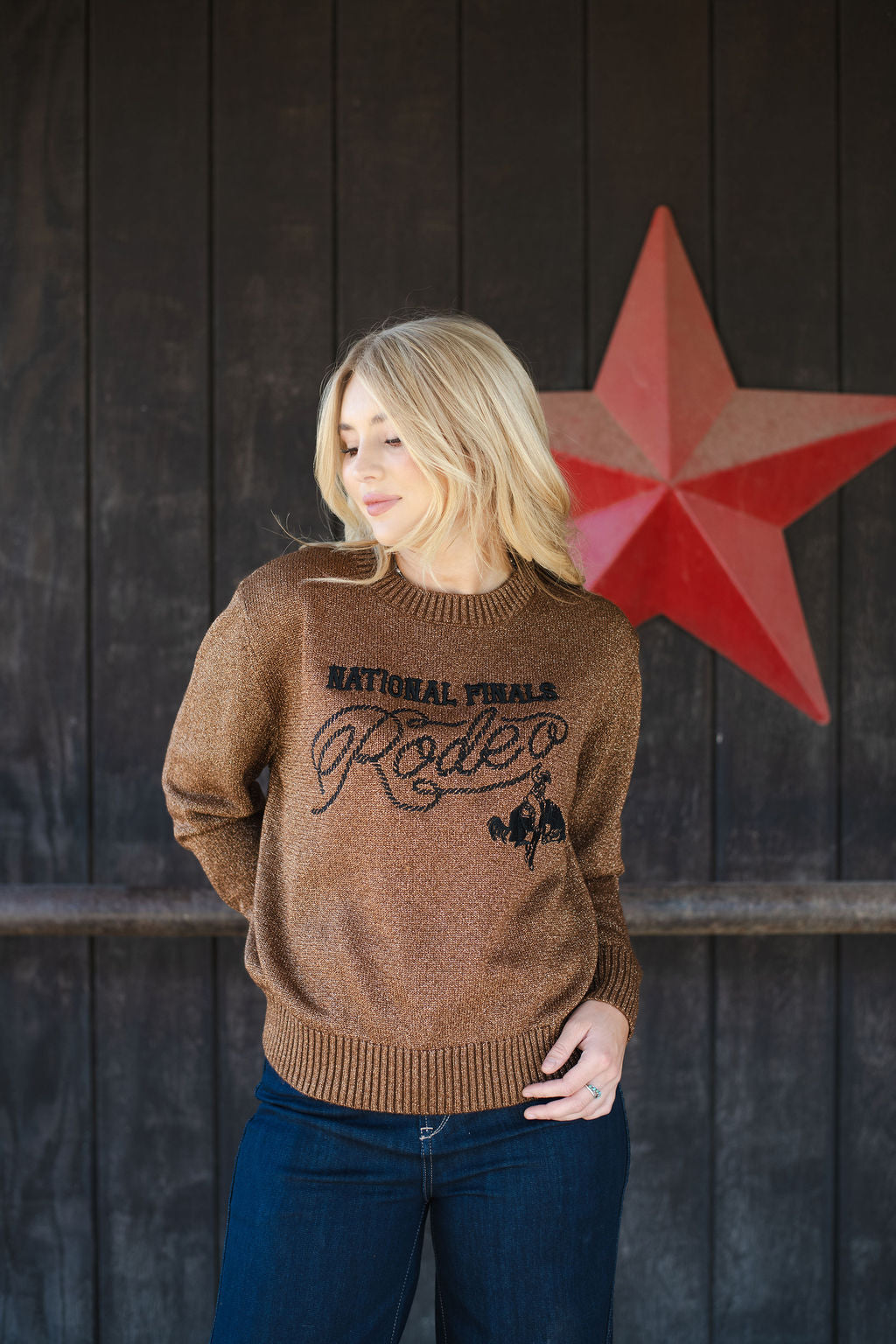 The NFR Shimmer Sweater brings sparkle to the showdown with a soft touch of glam and cowgirl grit. Featuring subtle metallic threads and a flattering fit, it’s the perfect piece to light up your look at the National Finals Rodeo. Cozy, eye-catching, and made to shine from dusk till dance floor.