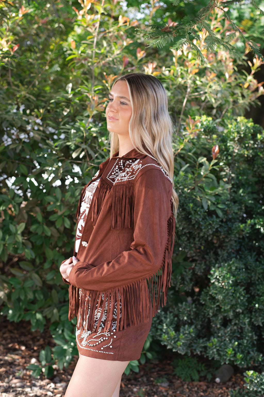 The Wildfire Wranglers Jacket is a show-stopping piece that combines classic Western style with a touch of elegance. Crafted from white leather, it’s adorned with sparkling diamonds and pearls on the front, with fringe cascading along the front, arms, and back.