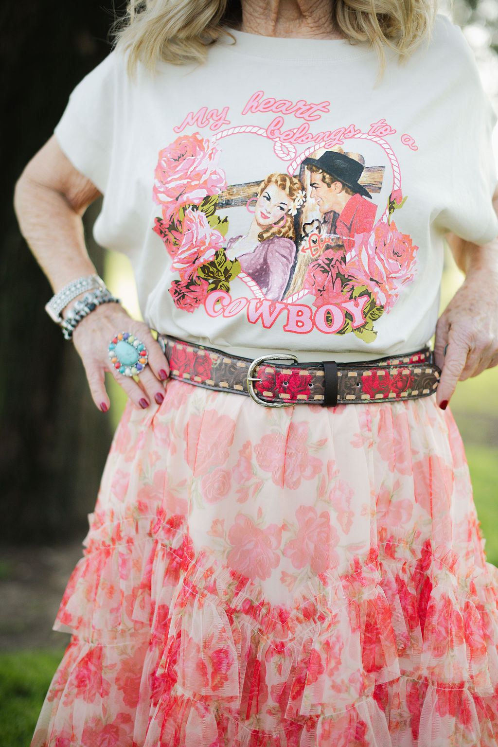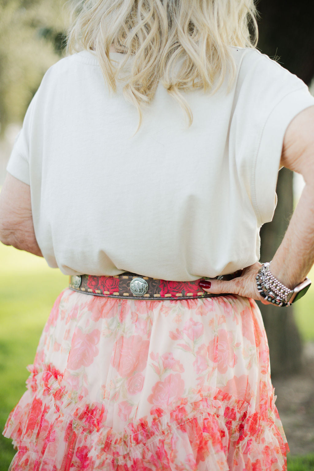 The Rosita Belt is where romance meets grit. Designed with rich red rose detailing layered over a deep brown base, this belt is finished with classic Western stitching and vintage-inspired silver concho accents for a look that feels both timeless and bold. Crafted to elevate everything from denim to dresses, the Rosita Belt brings a feminine edge to traditional Western styling. This is the belt you reach for when you want your outfit to feel intentional—strong, confident, and unmistakably cowgirl.