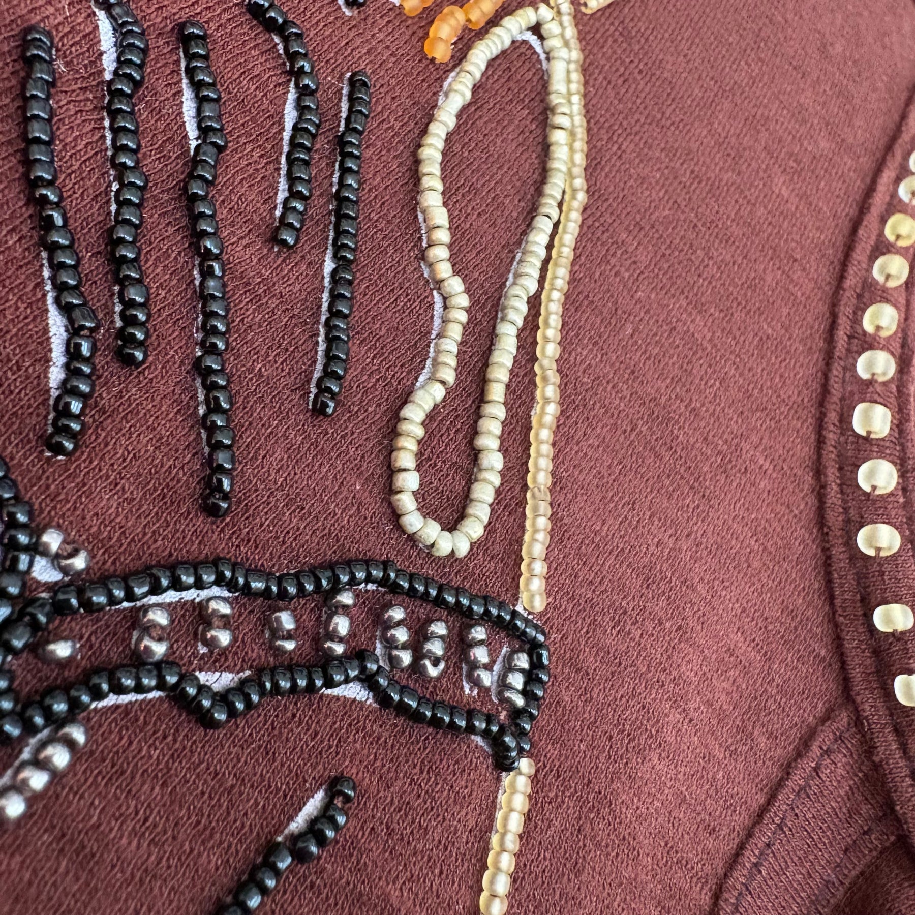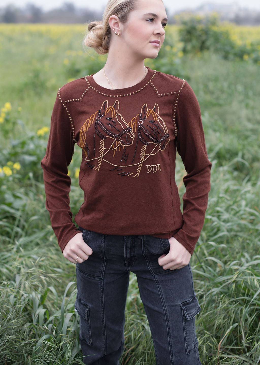 Elevate your Western wardrobe with the Clippety Clop Tee from Double D Ranch. This long sleeve tee showcases an exquisite beaded design featuring horse heads, adding authentic ranch-inspired style to your everyday look. Perfect for rodeo enthusiasts and Western fashion lovers who appreciate quality craftsmanship and eye-catching details.