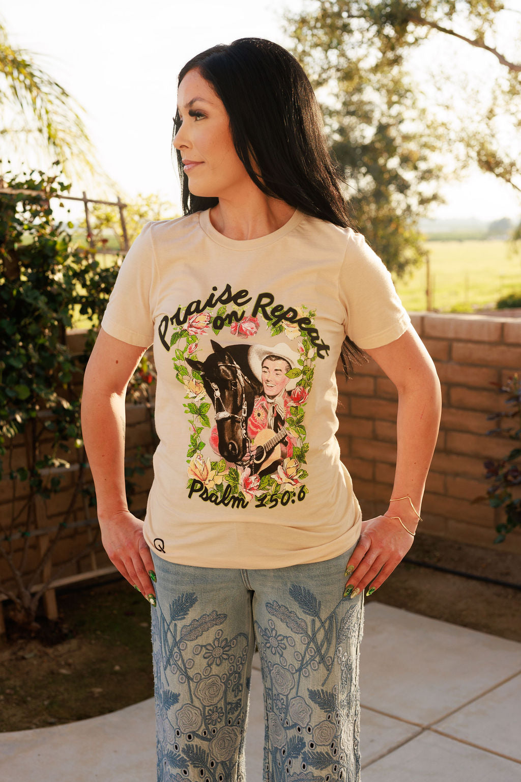 The Praise on Repeat Tee is for the cowgirl whose worship doesn’t stop at Sunday. It’s daily. It’s joyful. It’s lived out loud. Featuring a cowboy singing praises with his guitar, his horse by his side, and surrounded by soft spring florals and roses, this design captures the heart of Western life and faith intertwined. It’s worship under open skies. It’s gratitude in every season. Comfortable enough for everyday wear, and meaningful enough to spark conversation. Because our praise shouldn't be occasional. It’s on repeat.