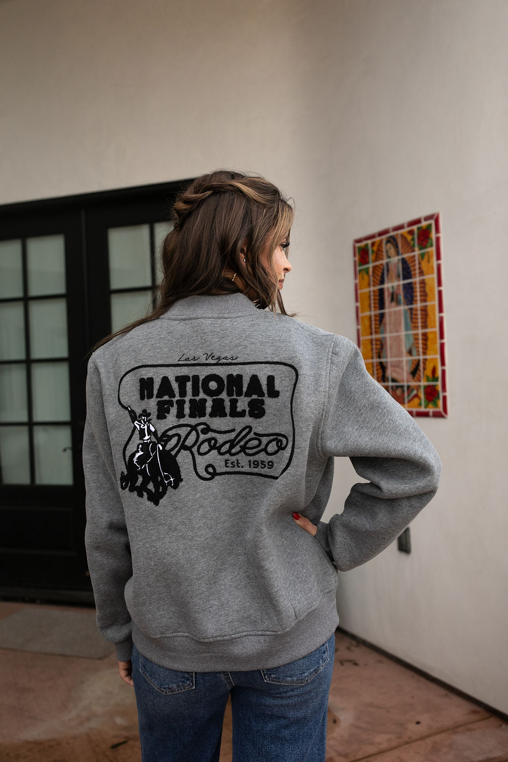 The Grey NFR Bomber blends sleek city style with rugged rodeo attitude. With its cool-toned hue, bold Rodeo Quincy detailing, and classic bomber silhouette, this jacket is made to stand out in the stands or on the streets. It’s the perfect layer for the cowgirl who rides with edge and elegance.