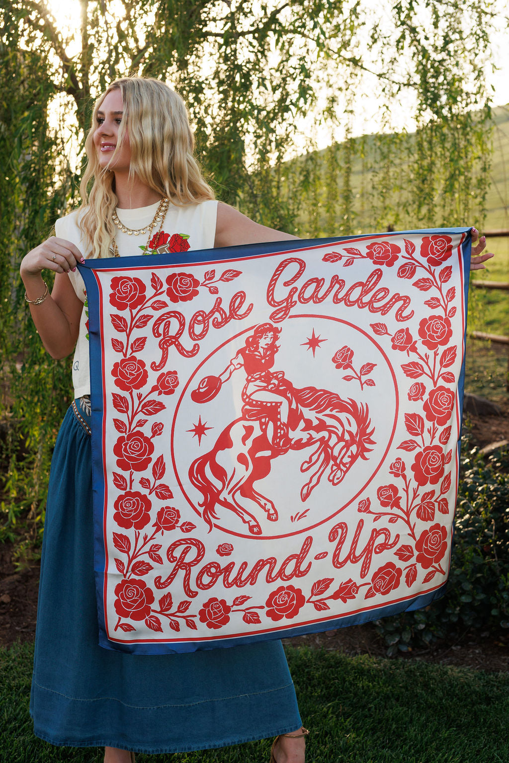 The Rose Garden Round Up Wild Rag is the ultimate finishing touch for your spring rodeo wardrobe. Crafted from luxurious 35x35 silk, this classic wild rag features a rich navy border and cream base adorned with red roses and a charming bronc riding cowgirl that captures the heart of western heritage. Timeless yet feminine, this silk western scarf ties effortlessly around your neck, in your hair, or on your bag for a polished look.