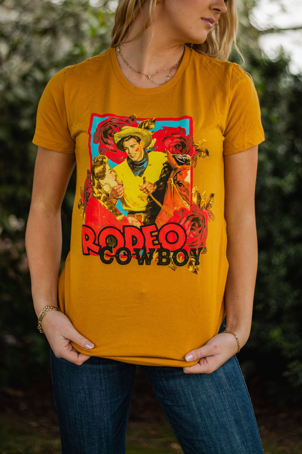Saddle up in style with this adorable mustard-hued graphic tee celebrating the spirit of the rodeo. Featuring a charming cowboy design, this casual essential brings western flair to your everyday wardrobe. Soft, comfortable, and perfect for rodeo fans and western enthusiasts alike, it's the kind of piece that pairs effortlessly with jeans and boots for an effortlessly cool look.