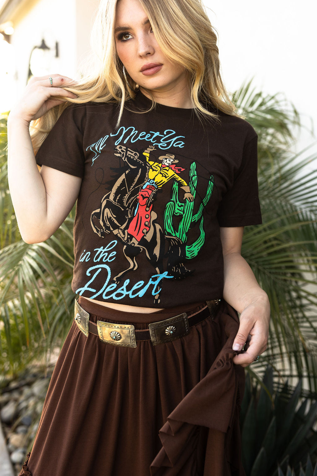 The Meet Ya in the Desert Tee is a warm brown t-shirt featuring a bold, colorful graphic of a cowboy riding through a vibrant desert scene. With its eye-catching hues and classic Western vibe, this tee brings adventure and attitude to any outfit.