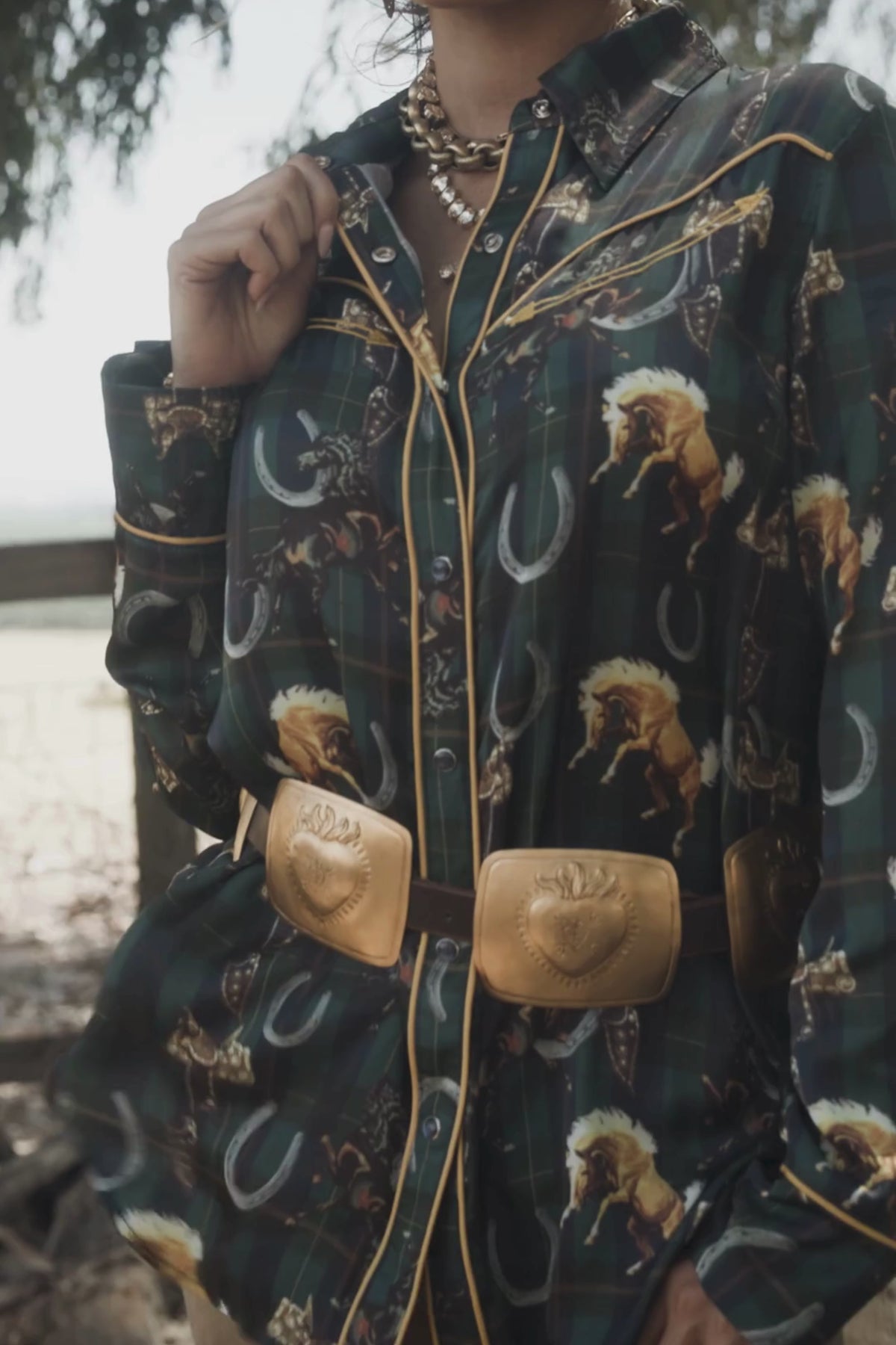 The Lucky Plaid Pony Buck Button Up captures the spirit of the open range with timeless Western style. Featuring cream horses trotting across a classic green plaid, this button-up blends rugged charm with Rodeo Quincy flair. Soft, versatile, and full of personality — it’s made for the cowgirl who rides with luck on her side.