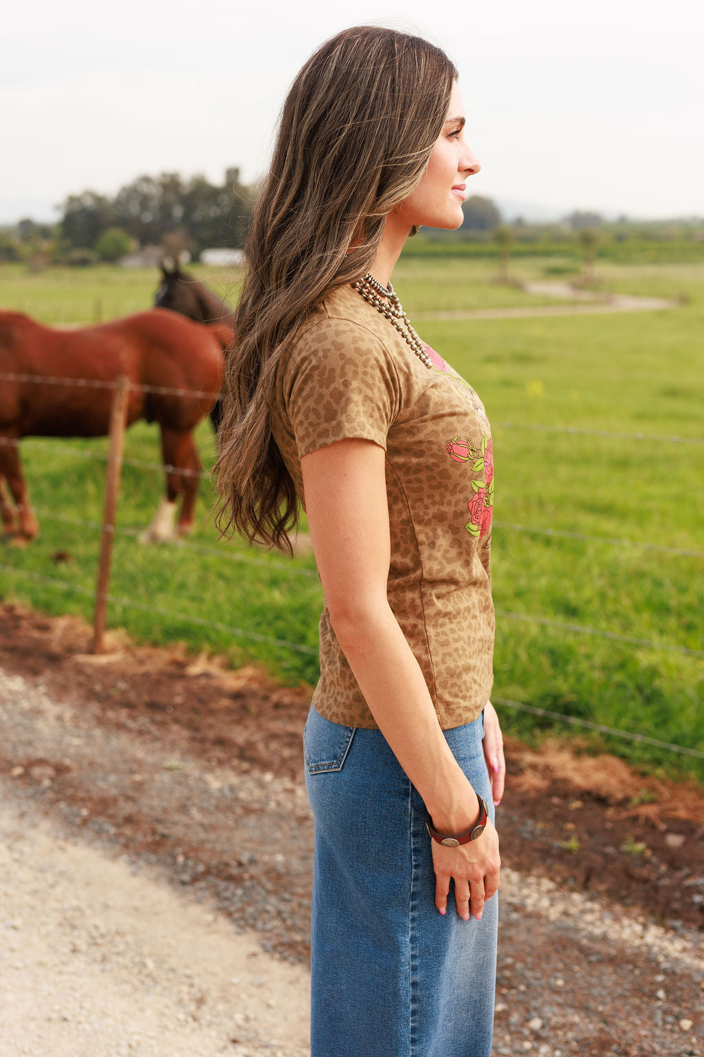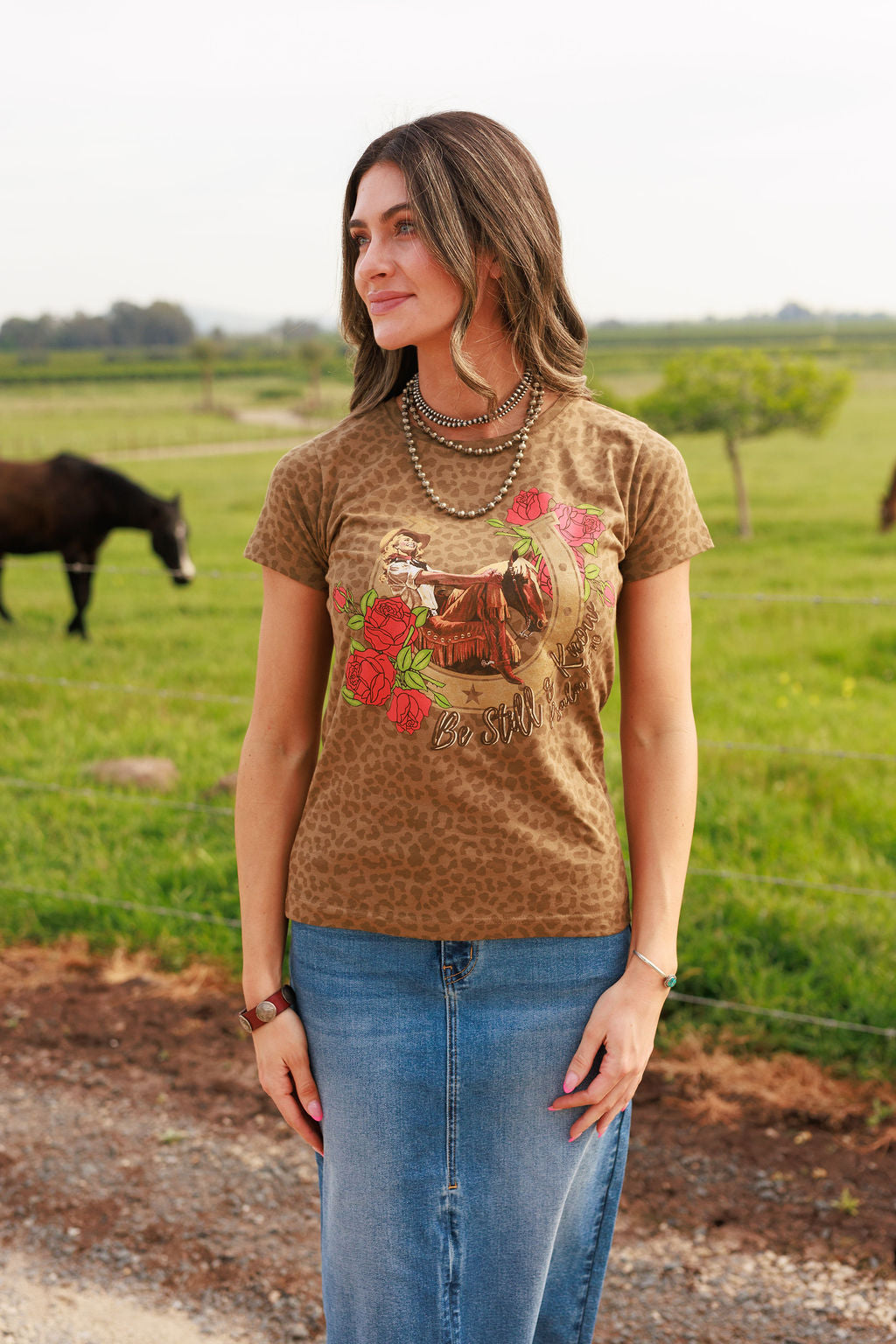 The Be Still & Know Tee is a reminder for the cowgirl who carries both fire and faith. In a world that moves fast, this piece calls you back to stillness- to trust, to surrender, to steady confidence. This design blends Western edge with soft femininity, featuring a cowgirl and her horse surrounded by roses, layered with subtle leopard detail and finished with a golden sparkle horseshoe. Sometimes the most powerful thing you can do is stand still and trust the One holding the reins.