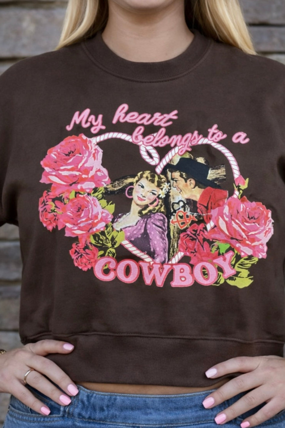 Wrap yourself in Western charm with this adorable brown sweater featuring "my heart belongs to a cowboy" in sweet pink letters. The design showcases an enchanting cowboy and cowgirl nestled together in a heart-shaped lasso, surrounded by delicate roses. Perfect for rodeo lovers and country enthusiasts who want to wear their heart on their sleeve—literally! Cozy, cute, and undeniably romantic, this sweater celebrates that special cowboy connection with playful style.
