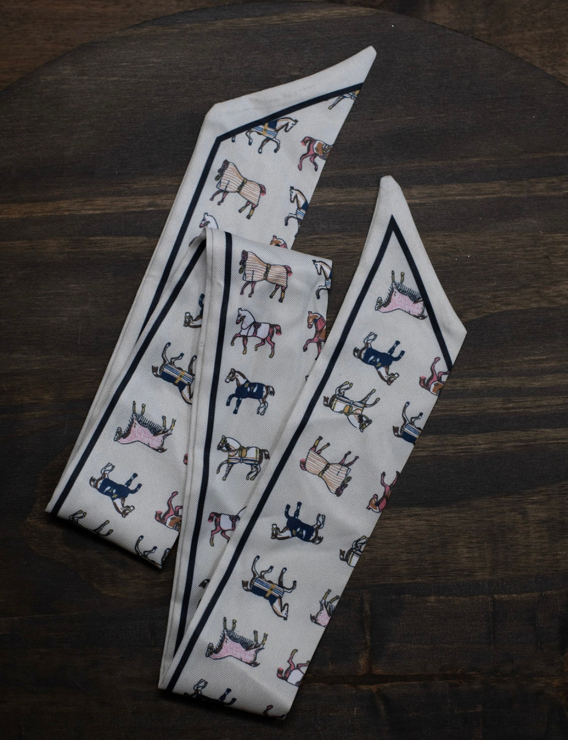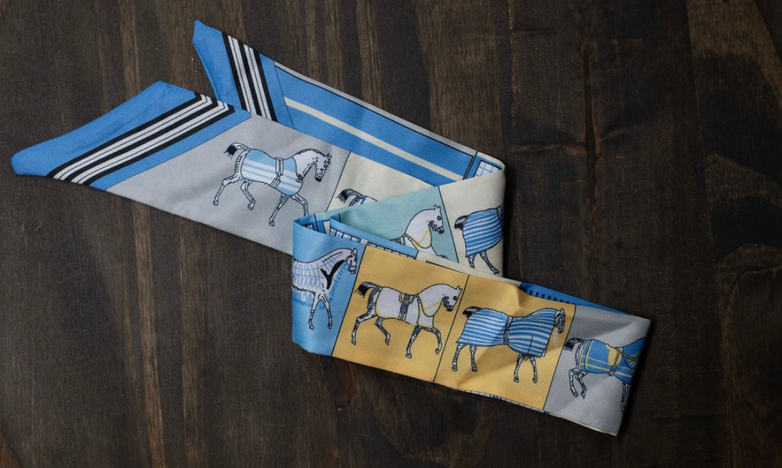 The Regal Rider Twilly Scarf is a sleek silk accessory adorned with elegant horse designs, perfect for adding a touch of western flair to any outfit. Its slim shape makes it easy to style—tie it around your neck, wrist, or handbag for a chic cowgirl finish.