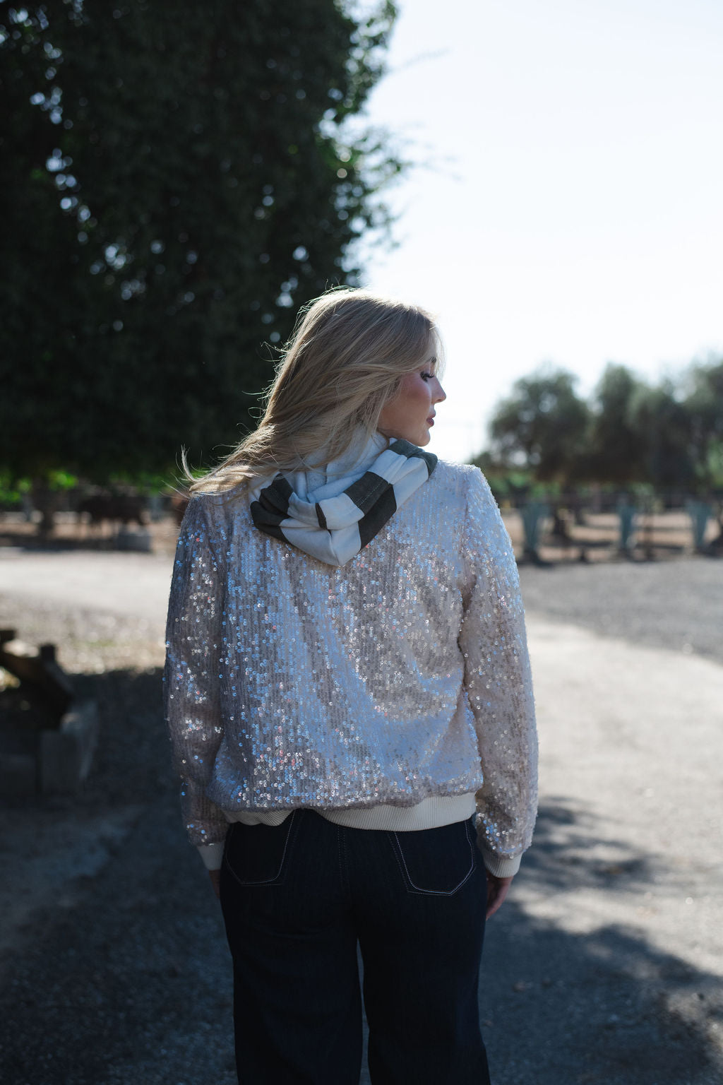 The Sunset Range Bomber Jacket is western glam at its finest, featuring a crisp white silhouette that shimmers with sequins. Bold yet versatile, this statement jacket is made to shine.