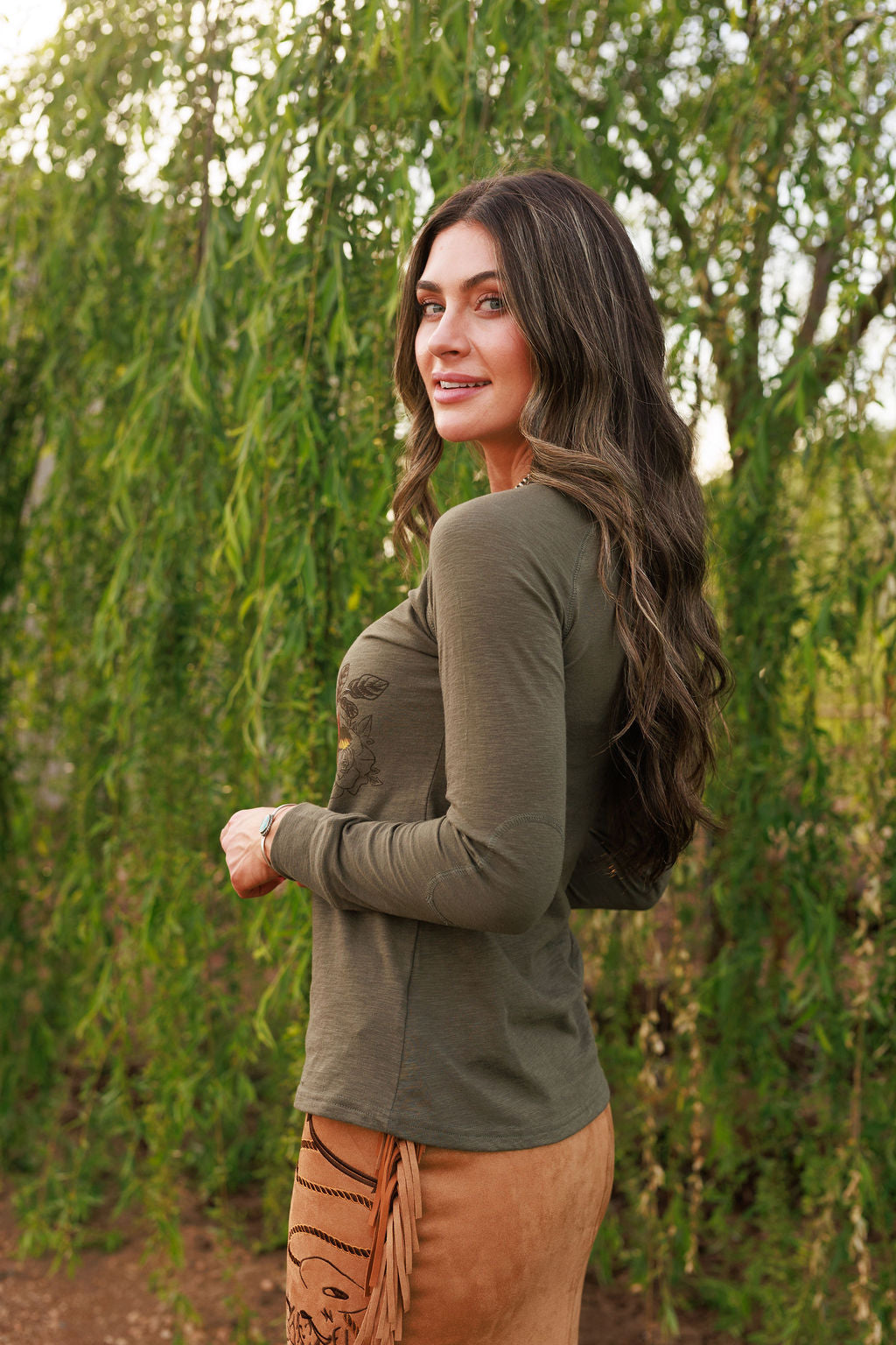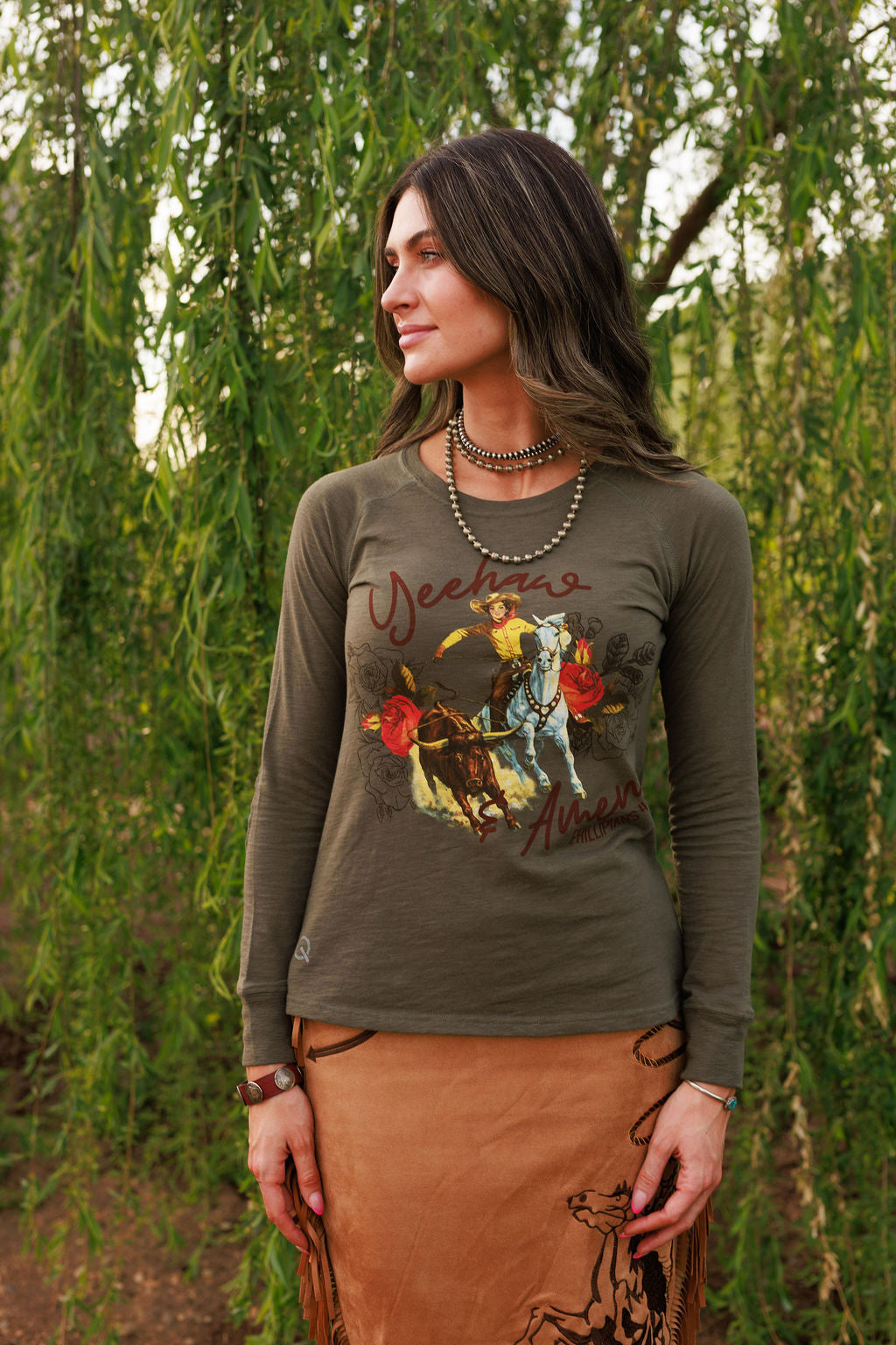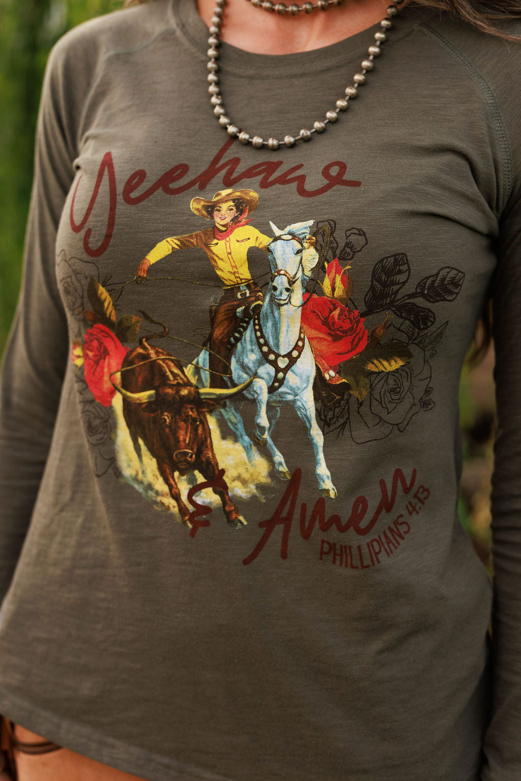 TheYeehaw & Amen Long Sleeve is for the cowgirl who can say her prayers and swing a rope. Featuring a steer roping cowgirl framed with soft floral rose details, this design blends rodeo heritage with feminine spring touches- the perfect balance of grit and grace .Printed on a olive long sleeve tee, this 100% cotton graphic offers that lived-in feel you love with a relaxed, easy silhouette. It’s breathable, comfortable- making it a go-to for spring styling and faith-forward everyday wear.